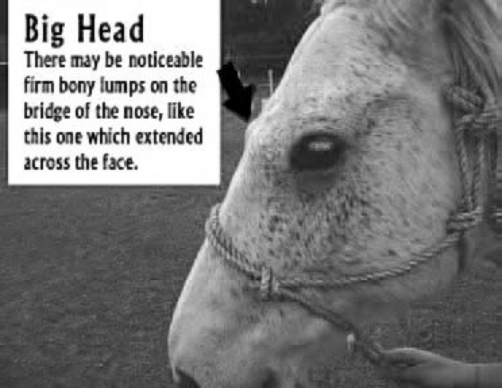 "Big head" or nutritional secondary hyperparathyroidism (NPH) is a condition whereby the horse's body is not receiving enough calcium. This calcium deficiency may be the result of the horse eating grasses which are high in oxalates. The oxalates bind to the calcium and render it not able to be absorbed by the horse's gut. Buffel grass, kikuyu and setaria are the most common grasses to cause big head.